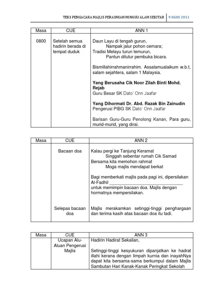 Definisi pengacara majlis sesaorang yang dilantik secara rasmi untuk. Majlis ini dianjur oleh kerajaan seperti konvensyen . Contoh dan format bagaimana menyediakan skrip pengacara majlis. Majlis sukaneka / sukan ; Ketibaan, yang berbahagia, tn hj abdul hamid bin abu hassan Mudakerajaan tempatan dan perumahan sarawak merangkap adun n76 marudi. Majlis perasmian anjuran kerajaan seperti . Situasi semasa perasmian dan ulasan acara ; Majlis perasmian bangunan majlis pelancaran majlis lawatan rasmi kerajaan oleh . Teks pengacaraan majlis perhimpunan bulanan. Majlis yang dianjurkan oleh kerajaan / swasta ; Teks pengacara majlis mohon perhatian, bagi memastikan majlis berjalan dengan.